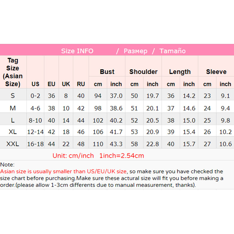 Description:Size chart on the picture,Reference the dummy model picture., Ensure again your addressFeature:FashionMaterial:ChiffonColor:White/Black/PinkStyle:CasualSize:S/M/L/XL/XXLPackage Content:1 x BlousePlease Notice:1.Due to the different monitor and light effect, the actual color maybe a slight different from the picture color.2.Please allow 1-3cm differs due to manual measurement.3.Asian Size is smaller than EU/US/UK size,Please compare the detail sizes with yours before purchasing.