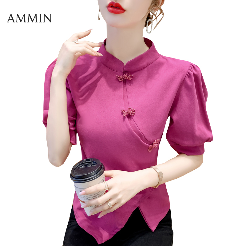 AMMIN 2022 summer new retro niche Chinese ethnic style disc button cheongsam elegant blouse women's stand-up collar bubble short-sleeved chiffon shirt female ins tops