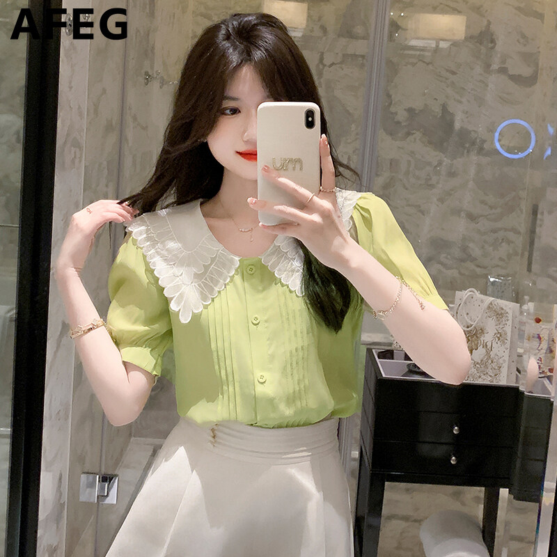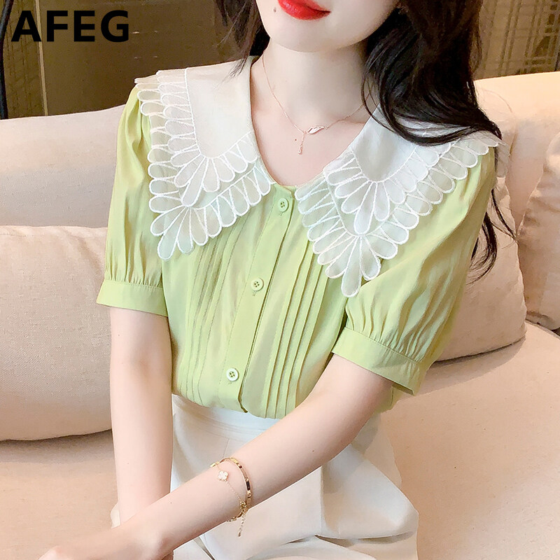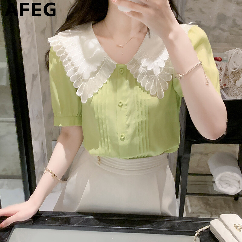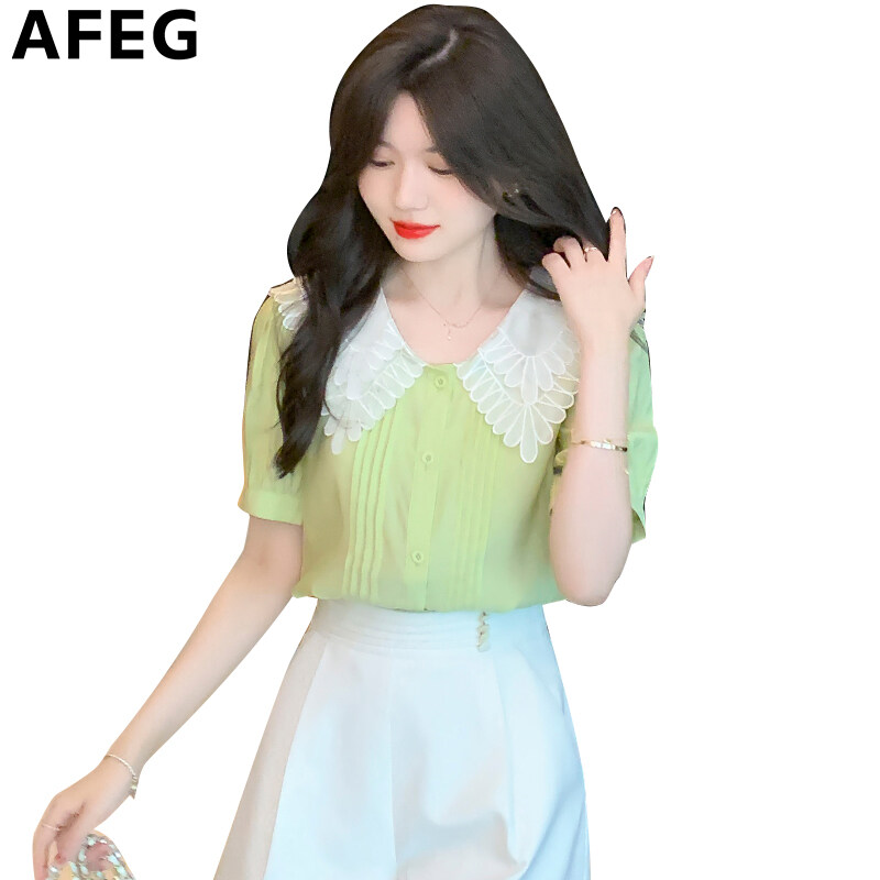 AFEG new Korean version doll collar fashion loose all-match temperament chiffon short-sleeved blouse for women