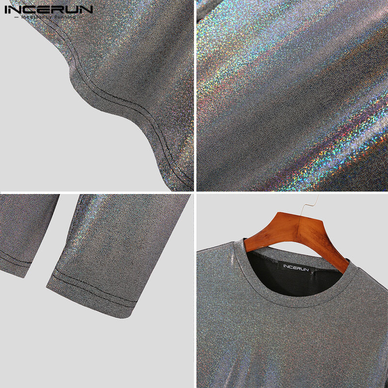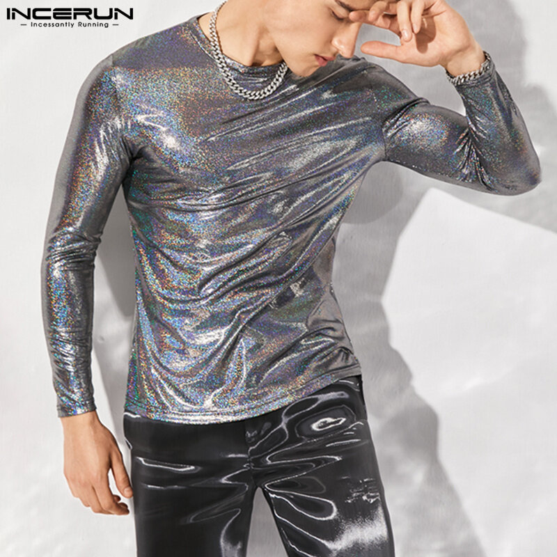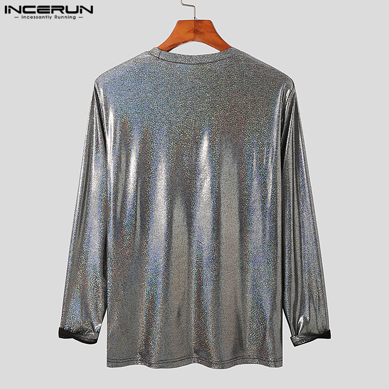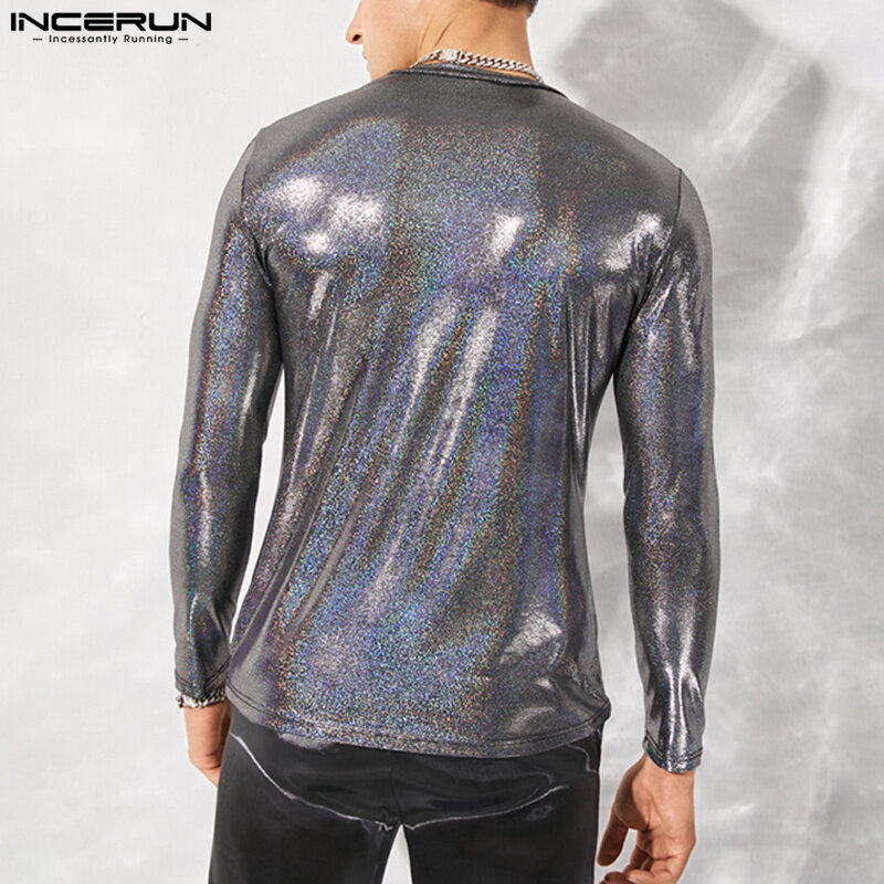 INCERUN Mens Long Sleeve Blouse O-Neck Fit Shiny Party T Shirts (Western Style)