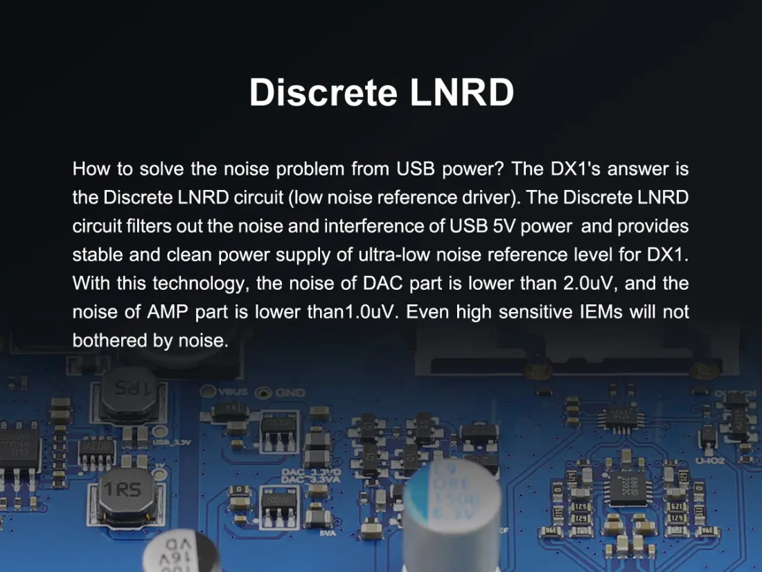 > In order to reduce noise from USB power, DX1 features a Discrete LNRD circuit(low noise reference driver). It filters out the noise and interference of USB 5V power and provides a clean and stable power supply to the device.