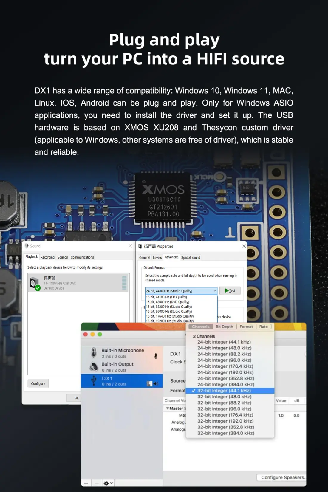 > Topping DX1 is an all-in-one solution for all your Hi-Fi needs. The device supports high-resolution PCM and DSD signal decoding bringing an authentic high-resolution audio experience to your desktop. It has an XMOS XU208 USB receiver chip that provides 32-Bit/384kHz and Native DSD256 signals.
