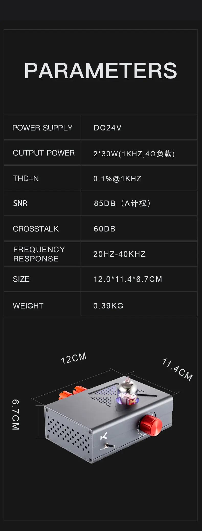 > Output Power: 2x30W(1kHz, 4Ω).