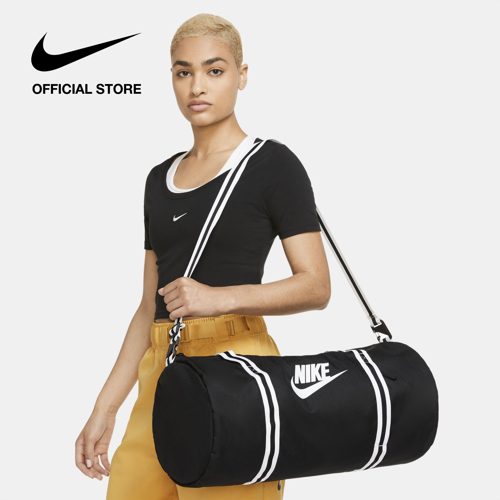 A tried-and-true travel companion, the Nike Heritage Duffel Bag offers extra storage when you need it. Its minimalist design is accented with striped woven details for a throwback look. An accessories pocket on the front panel provides secure small-item storage. This product is made with at least 65% recycled polyester.
