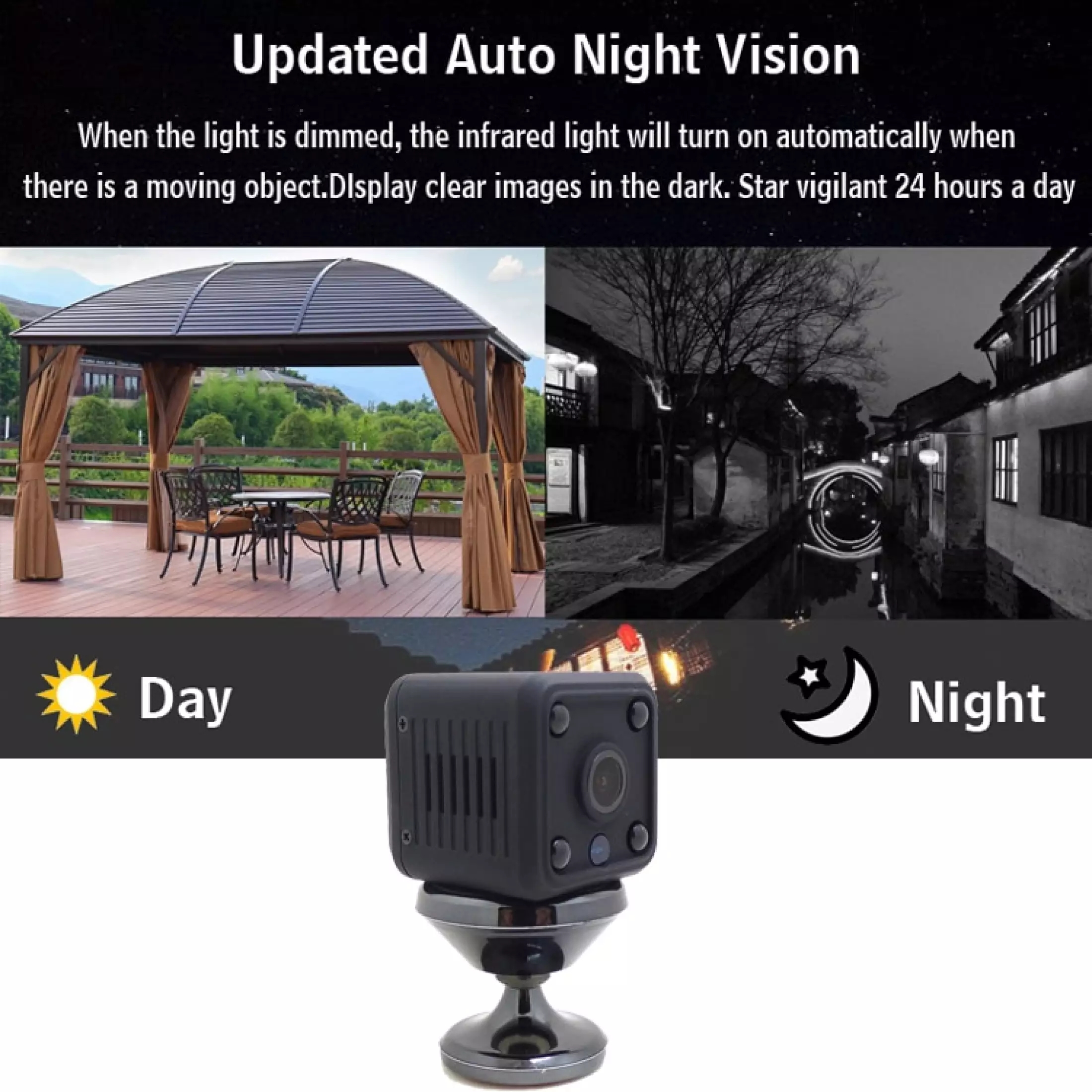 Functions: remote monitoring, motion detection, night vision without light.