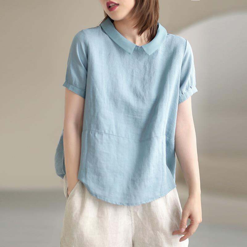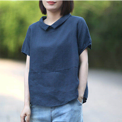 2021 Summer New Artistic Casual Korean Style Loose Casual Large Size Imitation Cotton and Linen Short Sleeve Stitching Lapel Shirt for Women